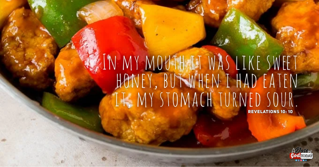 One of the popular Filipino dishes is “Sweet and Sour” which could be of fish, pork or chicken mostly. Even in any celebration, one could have this dish. Its sweetness and the sourness and the balance of the two would usually what gives us satisfaction in our appetite. However, there is another “Sweet and Sour” that is neither of fish, pork or chicken, but the Word of God. This is the sweet and sour that John in his Book of Revelation talked about.